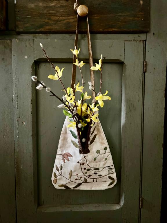 I lined inside with a primitive cotton fabric added a bit of walnut stain to age piece some..added a folky strap to hang from a door knob, cabinet knob hook etc..I added some spring forsythias and pussy pillows to inside pocket which can be removed seasonally…