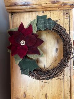 For your consideration is this 8" wool poinsettia wreath that I designed. It would look lovely on a primitive cupboard or a door! US shipping will be $5.00. Thanks for stopping by!
