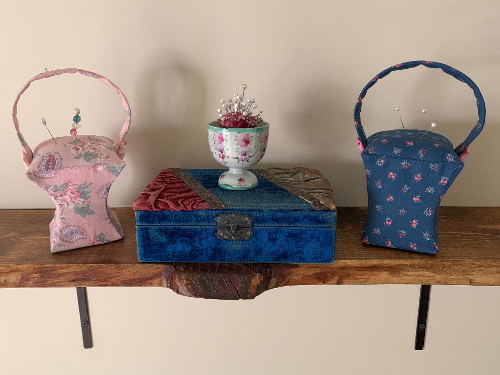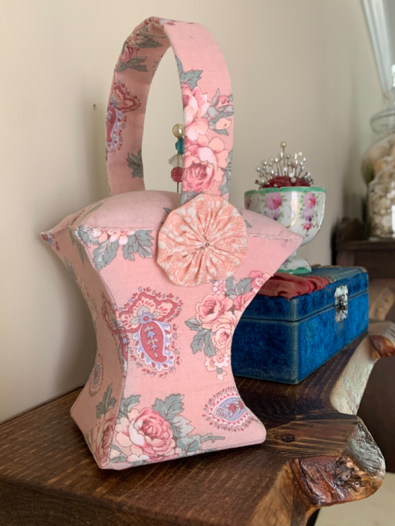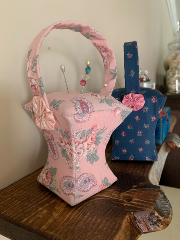 This basket is inspired by one in my collection from the 1800s. Rather than plain linen used on the original, this one is made from a vintage, blush pink floral cotton. It is a bit daintier than the blue one listed. It measures about 8” tall. Pins not included.