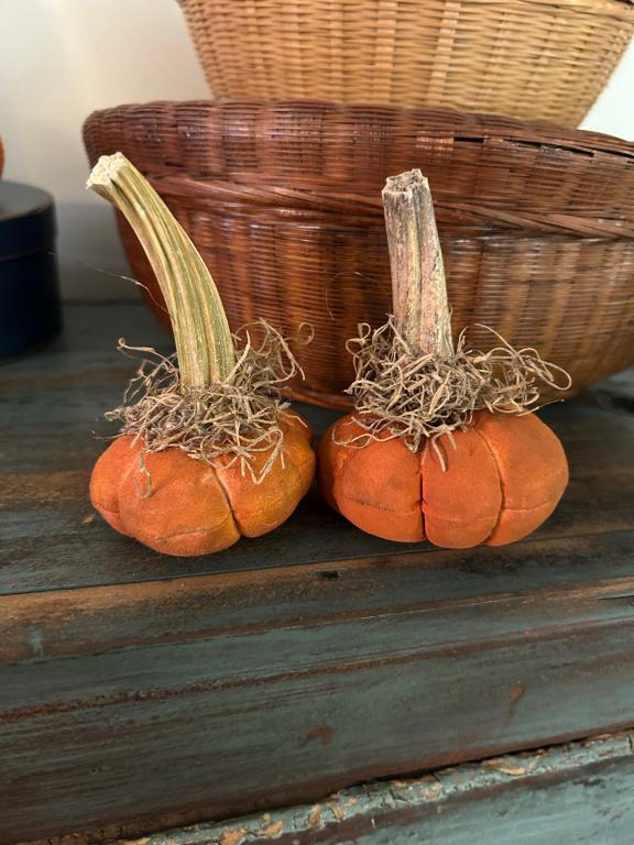 NeedfulsSet of two mini pumpkins I made out of painted stained muslin added real dried pumkin stems and Spanish moss to give a prim rustic look. These measures approximately 2 1/2” x 3” each …. Thank you for visiting