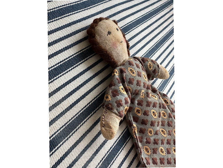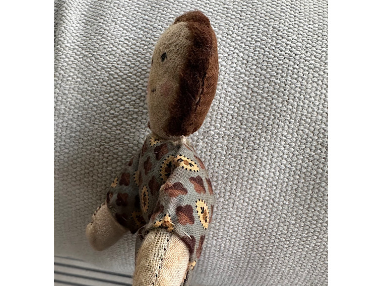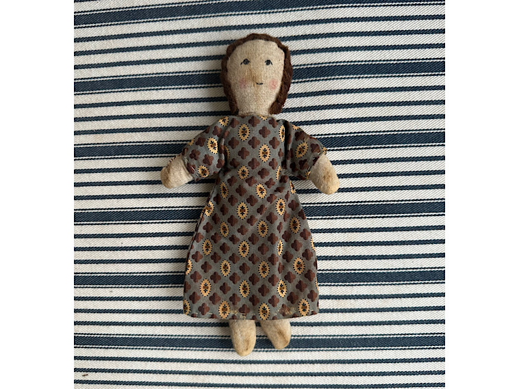 Miss Betsy Jane is a sweet little thing. Her body is made from vintage cotton with a few “repair stitches” on her arm, poor thing, to add to her primness. Please take a look at the photos to view the “repair stitches”. All the fabrics have been aged. All visible stitching is done by hand. There are a few old worn frayed marks on her dress. Her hair is a combination of brown wool and cotton. Miss Betsy Jane is 8 inches tall. She’s awful squishy and has my full ^^Admiration^^ Kindly asking $45 which includes shipping.
