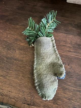 A sweet little mitten I made using wool yarn and Oxford punch on monks cloth….I added a greenish overdyed wool to back inserted simple greenery into the opening…added a rusty bell and pin to outside…would be adorable out all winter long, place on peg knob, in a wooden bowl or upon the tree….. Measures approximately 6 1/2” x 3” Thank you for visiting……