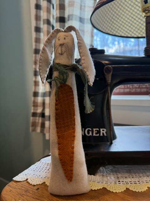 Mr. Wabbit proudly stands 12" tall and is 3" wide at his base. He is stuffed with wool and walnut shells at his base for stability. He is made with hand dyed wool. If you would like to adopt Mr. Wabbit for $50.00 you can email your contact information to lori@lilyannastitches.com