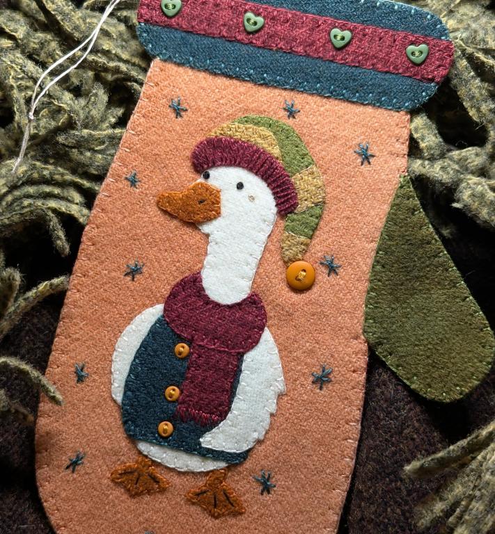 Handsome Murray Goose is all dressed up in his favorite vest and scarf. This mitten ornament is appliqued in wool using over-dyed cotton flosses and button eyes. Background wool has stitched stars to highlight this one of a kind 5" x 7" hand stitched heirloom ornament. Backing fabric is a wonderful homespun cotton. Design by Little Red Hen and lovingly stitched by me.