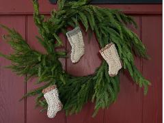 Three hooked stocking ornaments for your holiday decorating. They would look so sweet hanging on a wreath, garland, tree, peg rack and more, wool strips are hooked on the front and a piece of wool lines the back. There is no opening as this is a flat ornament. Each one is hooked in a basic overdyed dirty white with shade variations. Two are trimmed out in a dark rose color that resembles old faded red. One ornament is trimmed in a faded winter blue gray.