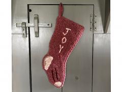 A woolen stocking hooked in strips of red herringbone wool with a primitive white toe and heel. From toe to top opening is 20 inches long plus a 3 inch long loop for hanging. The width at the top opening is 8 1/2 inches wide. The inside of the stocking is lined with cotton off-white fabric to protect the hooking from being snagged as you fill the stocking. The stocking is fully open and stuffable from top to toe. The front is hooked while the back of the stocking is sewn with the same fabric as the lining. $165 which includes shipping. If you have a question please contact me at terrileamer@gmail.com