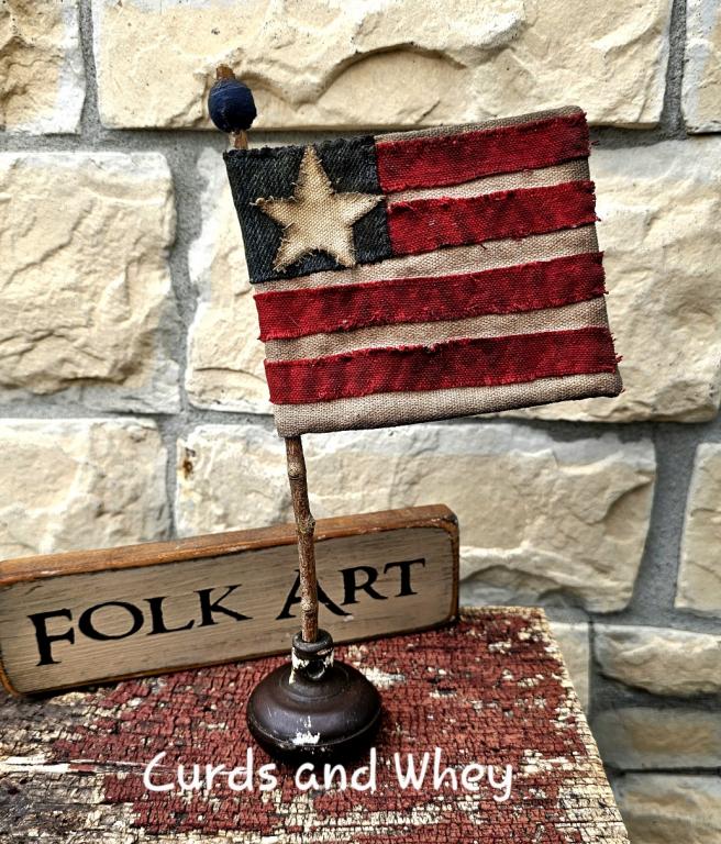 Show Your Pride and you display this perfectly prim flag! It is created from osnaburg and mounted in an antique old rusty door knob. It measures 11" tall and waves proudly.