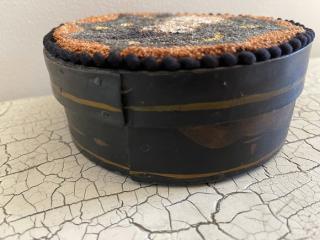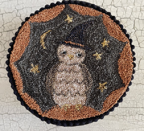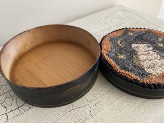 This punch needle owl was made with Valdani pearl cotton. It has been adhered to a vintage tole painted pantry box. It measures 5.25" round. The paint is original to the box and the inside is unfinished. The PN has mini black pom-pom fringe on the binding. The owl has black glass bead eyes. This was made using a cool pattern by Brenda Gervais. Will come signed and dated. Click on photo to see additional pictures. Kindly asking $110, plus $9 shipping