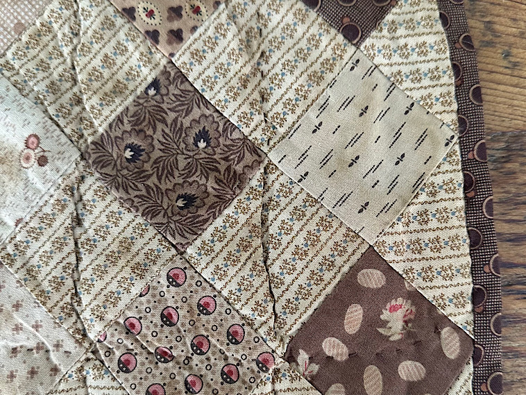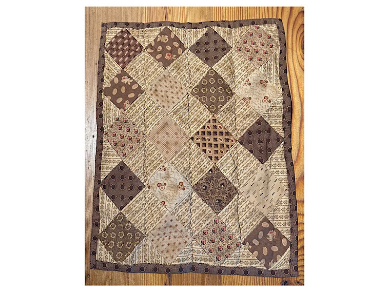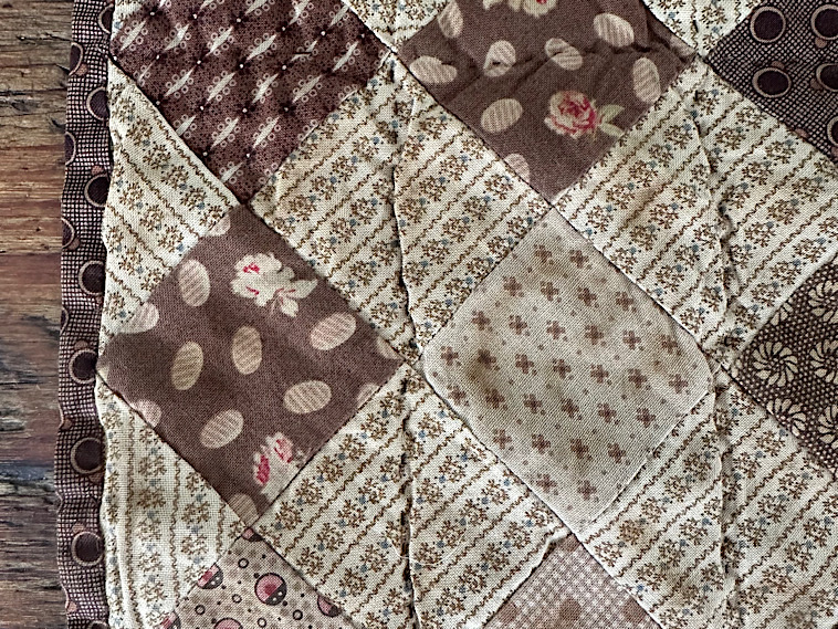 For an extra bit of charm, I set this patchwork quilt on point which creates a diamond effect. The technique is a bit more labor intensive than other methods but quite worth it. This sweet little quilt came out looking like its been folded in an attic for the last 200 years as it is a bit wrinkly around the lines of quilting stitches and in the corners. A collection of reproduction prints from the civil war era have been used to create this doll quilt. The fabrics have been dyed to add a bit of age. Cotton batting is sandwiched between two layers of cotton fabric. All visible stitching is done by hand. Kindly asking $85 which includes shipping.