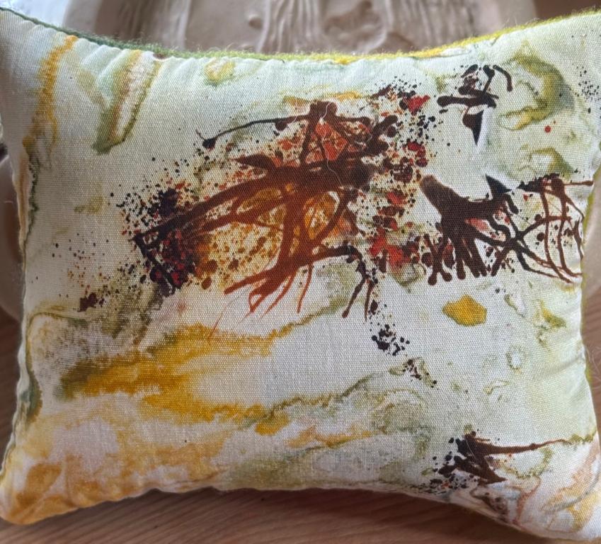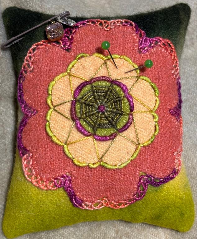 Fun large die cut peach wool flower with smaller die cut flower on a fun overdyed lime and dark green background wool. I added a lot of fun stitches ( I’m still learning!!) using Sue Spargo’s threads and stuffed it with crushed walnut shells and some premium polyfil. It measures 3 1/2” x 4 1/2” and weighs 6.3 ounces. If you have any questions please ask. Kindly asking $60 plus $5 shipping. Thank you so much for looking.