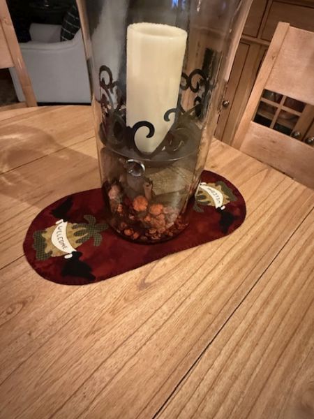 AppliqueThis welcome Pineapple table mat is hand stitched wool appliqué on a wool background. It measures 9” x 18” and is selling for $70 which includes shipping. Email lori@lilyannastitches.com to make payment arrangements. $70.00 Powered by