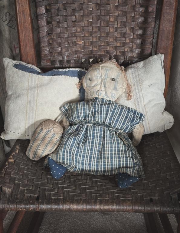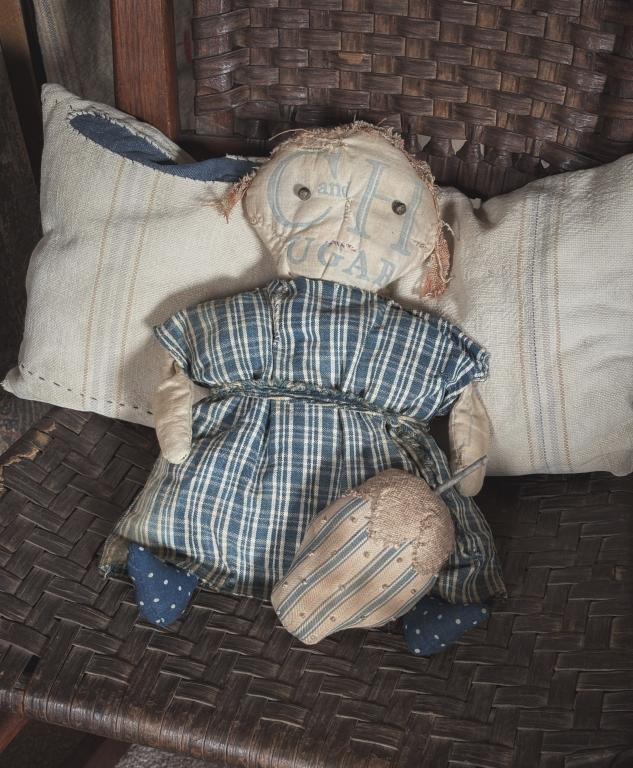 Sold. Love her! Made from an old sugar sack, she is dressed in antique blue fabric. She is lightly stuffed, measures 13” long and comes with a small ticking strawberry. Please email to purchase amijones.folkart@gmail.com $75.00