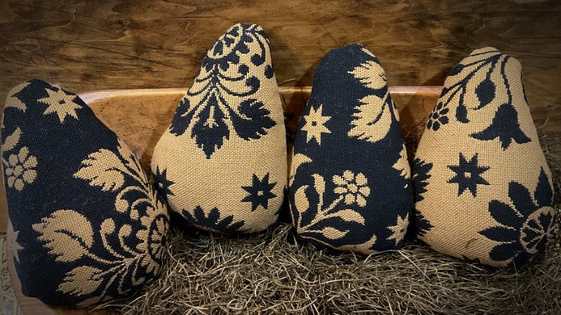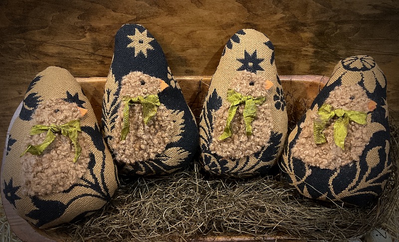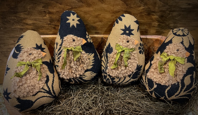 For your consideration, I have made 4 beautiful eggs. Each egg is made from my stash of Johnston Benchwork fabrics. I have added a sweet little chick to each egg. The chicks are made from curly plush fabric. They have black bead eyes, wool beak and an added vintage ribbon. They are firmly filled with poly and measure 7 inches tall. Perfect to add to a wooden bowl or trencher. Pattern is from T F C Folk Art. I have 4 to offer, each sold separately. Shipping is included in the price.
