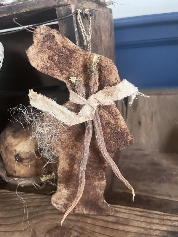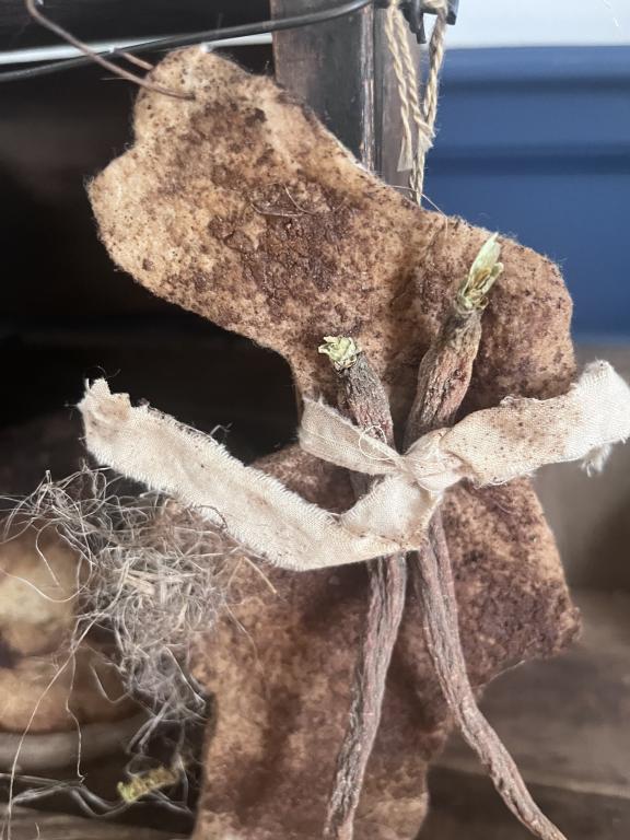 HolidayHandmade primitive grungy flattie bunny with carrots. This is extremely grungy and a wonderful addition to your Easter decor, comes with flax in the basket and dried carrots. Approx 7 in. Price includes travel $15.00