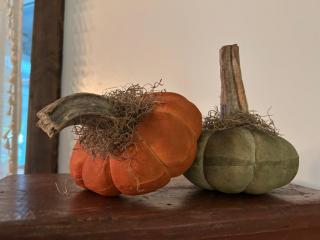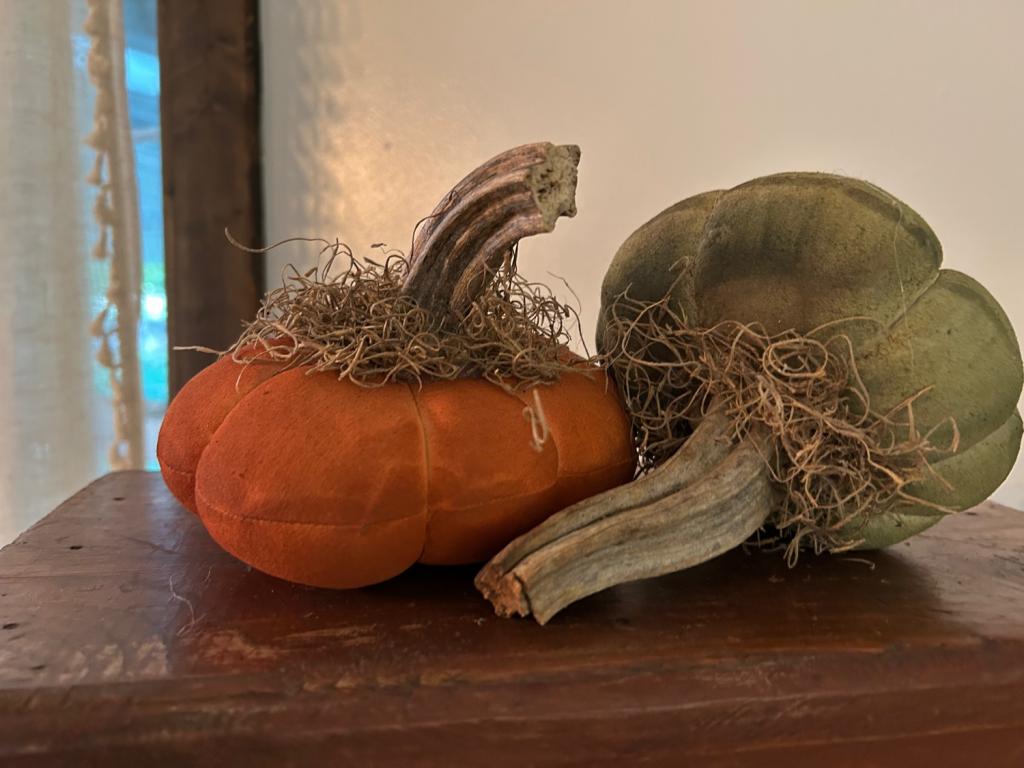 NeedfulsI made this set of pumpkin gourd out of painted stained sanded muslin, I added dried pumpkin stems to each Spanish moss to give a rustic prim look..each measure appropriately 5” x 7” Thank you for visiting