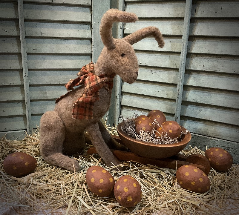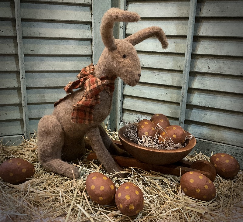 I have made the sitting bunny using plush fabric. I have gently grunged him with my spice mix. He has a sweet ribbon made of homespun fabric. I have weighted him, so he will sit nicely. Bunny has embroidered face and black beads for his eyes. His ears are bendable and his legs are also moveable. He measures just over 12 inches. He has his vintage wooden wheel barrow filled with 3 of my spun cotton eggs. Each egg is painted and antiqued. The wooden wheel barrow measures 10 inches long. Pattern for the bunny is made from Cinnamon Creek Folk Art. Shipping is included in price. A sweet pair that can be displayed year round.