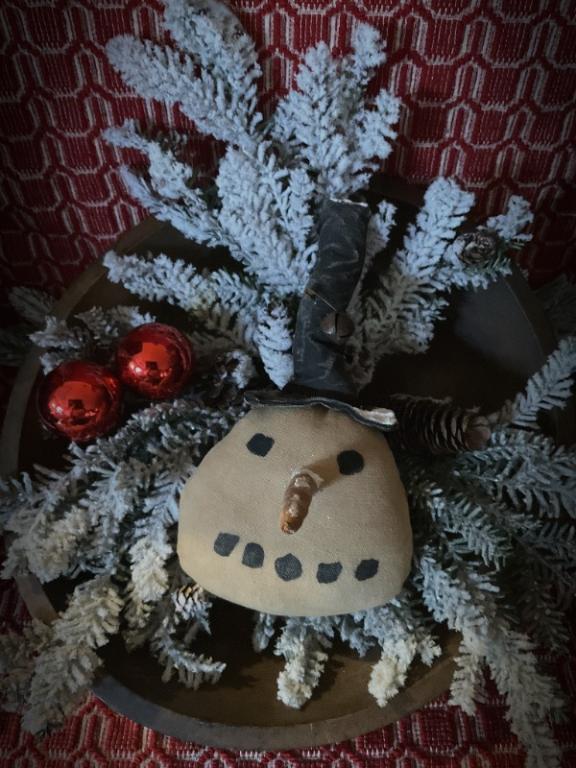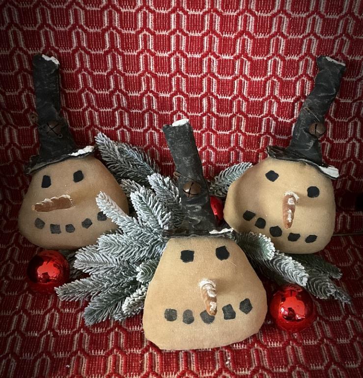 Snowmen heads are made from linen that has been grunged with my special spice mixture. His nose has been painted orange and I have added a little snow and sparkle. He wears is favorite top hat also sprinkled with a little snow and sparkle. They each have a rusty jingle bell on their hats. I have made three snowmen heads. These guys will certainly put a smile on your face They measure 11 inches tall and will hang nicely. They would also look so nice in a wooden bowl of filled with greens. Pattern is from Tickled Primitive. I have 3 to offer. Each sold separately. I will ship for free in the United States.