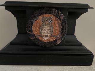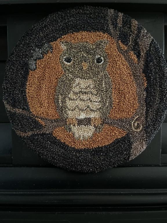 This punch needle owl was made with Valdani pearl cotton. It is mounted on a vintage wooden mantle clock base. This piece measures 15.75" wide at the bottom of the base, 10" tall and 7" deep. This was created using a wonderful pattern by Buttermilk Basin. The owl is embellished with black glass eyes. The clock base has some really cool etchings on it. It is vintage with some signs of wear, but very sound. The internal clock was broken and removed, so the back is hollow. This is the perfect piece for the Halloween collector! This will come signed and dated. Kindly asking $175, plus $15 for shipping