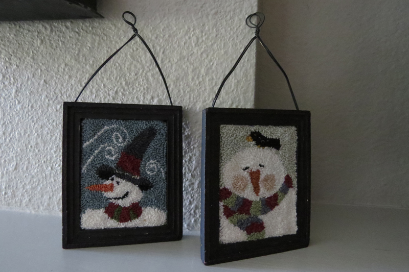 ***Select snowman on the left or on the right***...I am offering these two punch needle snowmen that have been mounted in small wire handle/hanger frames. The snowman on the left is wearing a tall hat and the snowman on the right is wearing a scarf and has a crow on top of his head. The wires can be used as a hanger, bent down to form an easel or left as shown. The frames, including the wire hanger is about 6"H x 3"W. The punching was done with a combination of Valdani and DMC threads. I am kindly asking 28.00 each, plus postage for a mailing envelope. I gladly accept paypal.....please email mommadonnatx@gmail.com to make a purchase. Thanks for your interest and your visit today to PHM!