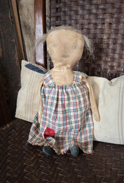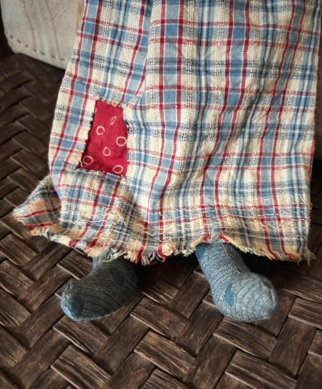 Sold. This sweet girl has a pencil drawn face and is dressed in old fabric. She measures 15” long. Cinnamon creek pattern used. Please email to purchase amijones.folkart@gmail.com $30.00