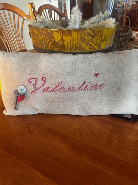 Cross StichThis is a large red work cross stitch pillow, stitched on linen. It measures 17" x 8." It has a vintage key as well as an antique strawberry emery attached. US shipping will be $10.00. Thanks for stopping by! Sold, thank you!! $42.00