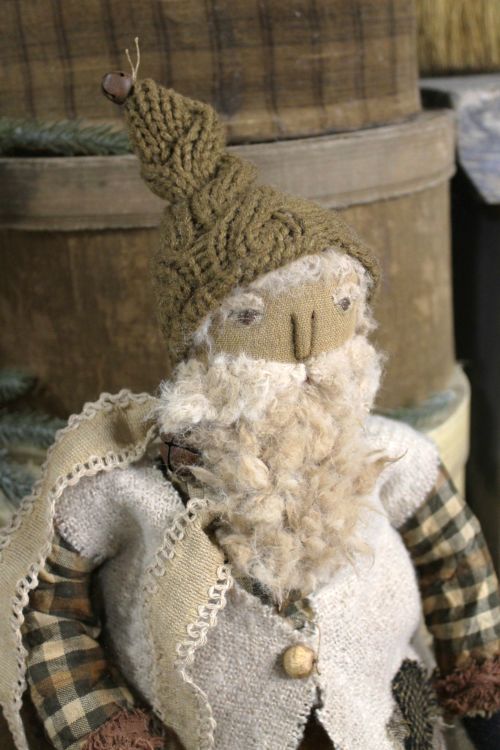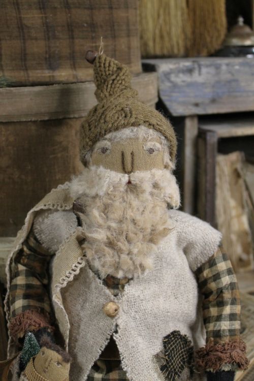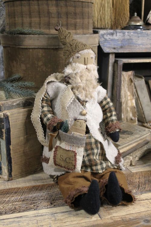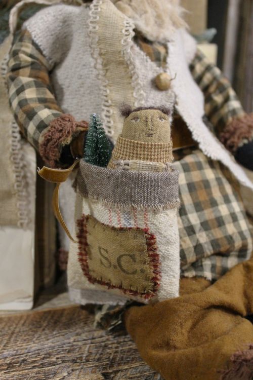 Hello and thank you for stopping by! I have a handsome new Santa available. He measures 18.5 inches long not including his hat. His stuffed with both fabric scrap and poly fil. His face is handstitched, his beard, brows and hair are sewn on, and his teeny red mouth is needle felted wool. His arms are wired for posing. He wears flannel pants, fleecy black boots and mittens, an aged cotton shirt with a soft, lightly aged vest. His pant and shirt cuffs have a brown trim as well as his vest. He wears a knitted hat and a scarf with a rusted bell attached to each. Saint Nick is carrying his bag made of antique grain sack with a brown, linen trim and is attached to his wrist with a piece of velvet ribbon. Inside the sack is a teeny, tiny doll. She is not attached so you can remove her and keep her out all year if you'd like. There's also a tiny bottle brush tree. Please click on his picture for additional pictures. This Santa is loaded with details and is available to ship on Monday December 15th. Not meant for wee hands. Rustic Santa is $110 plus shipping Thank you for stopping by! Blessings, Lynn