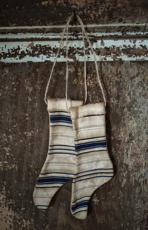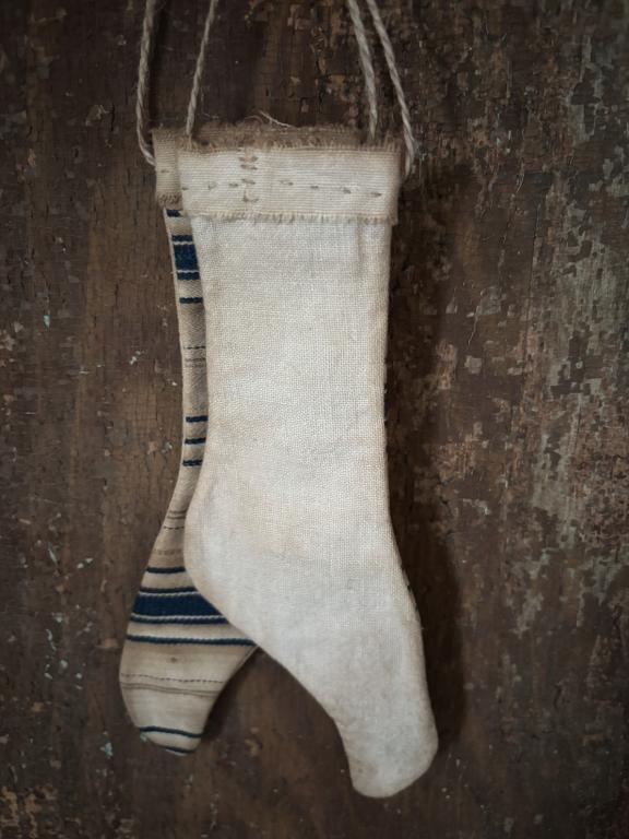 Sold. Made from antique blue and cream ticking, the backs are antique cotton. They are lightly aged, and measure 7” long not including the string. Please email to purchase amijones.folkart@gmail.com