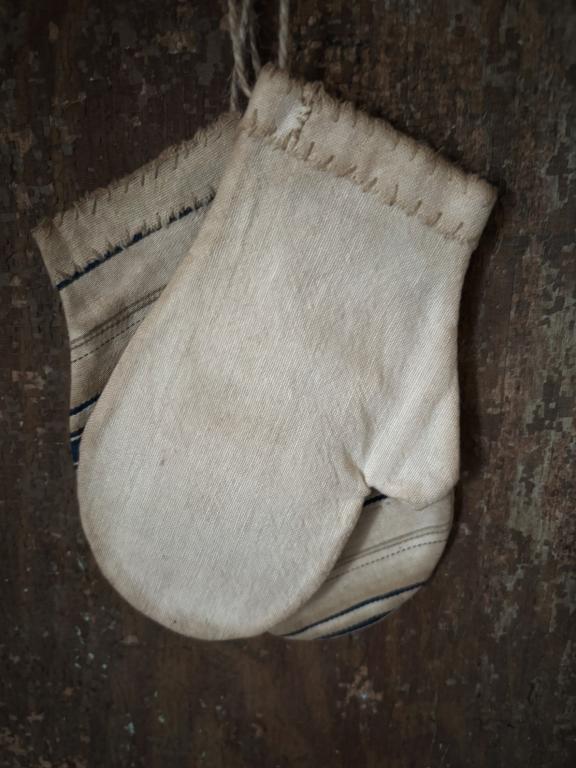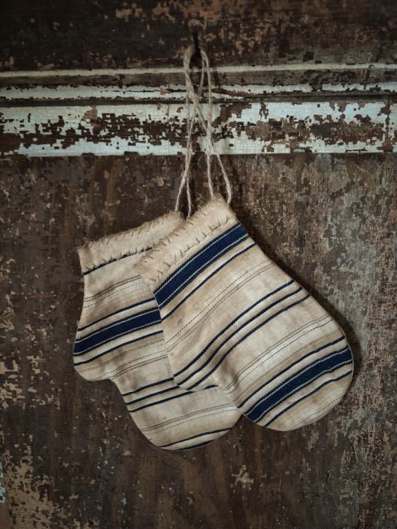 Sold. Made from antique blue and cream ticking, the backs are antique cotton. They are lightly aged, and measure 6” long not including the string. Please email to purchase amijones.folkart@gmail.com