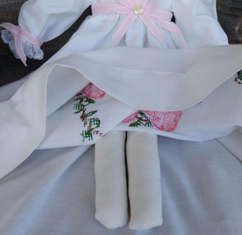 "SHEILA" is an incredibly sweet little Church Doll. Many years ago, little girls kept quiet in church by playing with their "church doll". SHEILA is 23 tall by 8 inches wide. Her skirt is made from a pillowcase that has been embroidered with pretty pink roses. She also has a cute little bonnet tied with pink ribbon. Handmade by me but NOT tea stained yet. SHEILA looks so pretty in her pure white dress I really just hated to PRIM her up. If she doesn't sell as she is, I'll consider PRIMMING her. But for now, crisp white!. Kindly asking $79.00, with additional shipping of $7.95. Email me at VG004@COMCAST.NET to arrange payment for your purchase. I accept PayPal and Personal Checks. Thanks so much for shopping with our group!