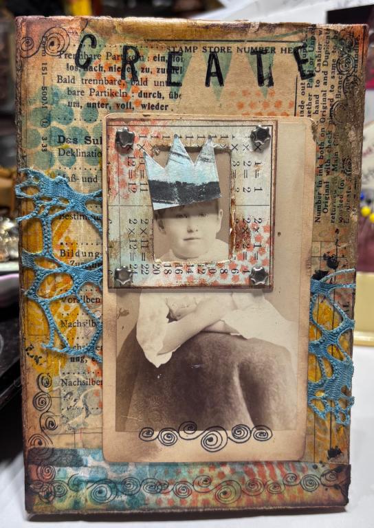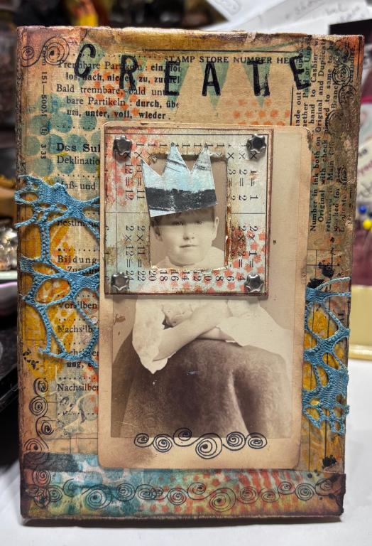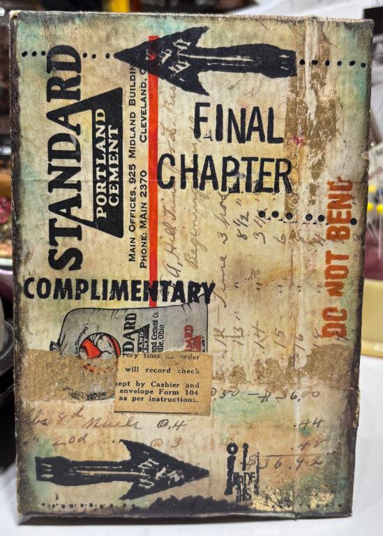 This offering is a small journal I created a couple of years ago I kept because I loved it, but have decided to offer it today for sale. It has hard cardboard or paper mache covers that I collaged using a variety of mixed media and a vintage small CDV of a boy on the cover. The covers are sealed and the pages inside are a brown craft paper that can be written on or sketched on etc. it does not lay flat when open but some clips to hold the pages open should be helpful. It’s a nice pocket size at 4”x6” and about 1/4” wide so you can carry it with you and jot things down etc! If you have any questions please ask! ^^Trust^^ I will include a small packet of ephemera with it as well so you can start your own collages!! Kindly asking $28 which includes the shipping. Thank you so much. If you click on the aim page you will see the back of the journal. Thank you.