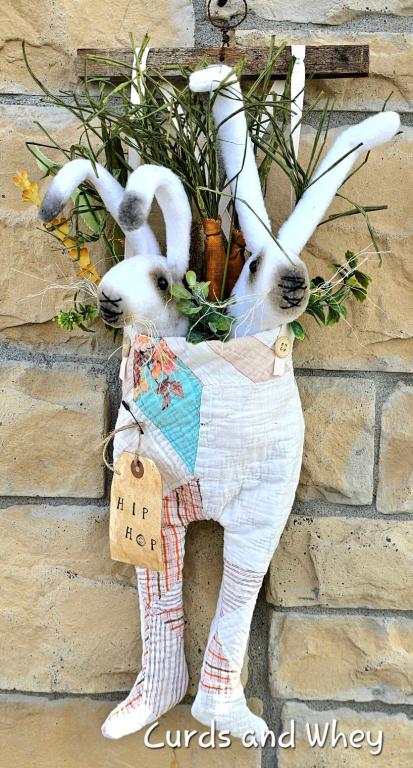 These sweet bunny sisters are safely tucked into this pair of suspenders, made from an old quilt. They have bendable ears to pose as you like. They are nestled in a pocket of the suspenders, surrounded with greens and carrots. The suspenders are attached to a piece of old wood and measure 22" to the tip of the wire hanger. This piece would look wonderful welcoming visitors at the front door!