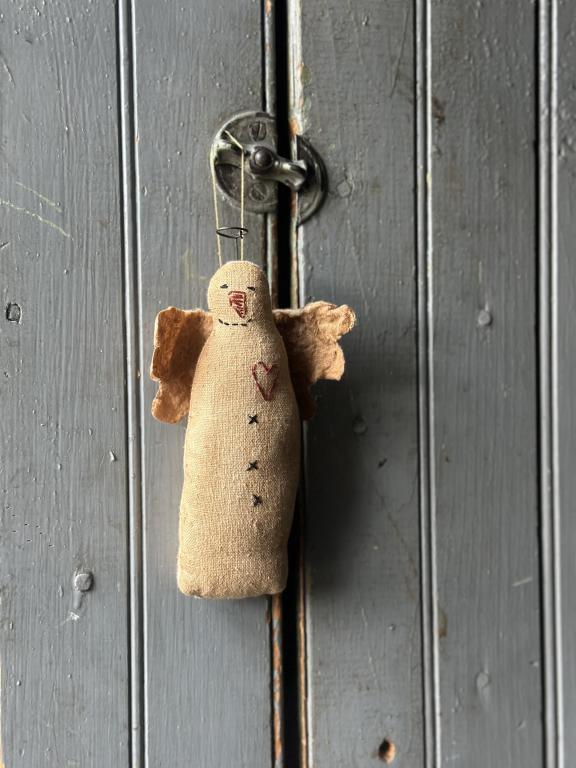 What’s a snowfall without a snow angel to mark the event? I’ve made my own version of a snow angel out of hand dyed cotton fabric and stitched in all the details freehand with prim stitches, even a heart for all the love included. Wings are made from dyed cotton batting that has been stiffened. Although it’s hard to see in the photo, the wings are the same shape and size on both sides of the snowman. The halo is made from rusty wire.There is a hanging loop which is about 2.5 inches. The snow angel measures 6 inches long, not including the halo and hanging loop. Kindly asking $30 which includes shipping.