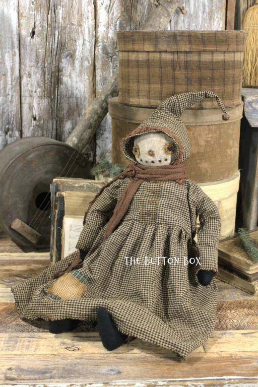 SOLD! I love how she turned out. This beauty measures 19.5 inches long not including her hat. Her head is heavily aged, then painted, lightly sanded and she has a wooden nose and a stitched mouth and eyes. She wears a skinny stocking cap with a rusted bell on the end and a matching dress and matching pants. All heavily aged. Her "mittens" and "boots" are black flannel, and I added a couple of aged patched to her dress. Her arms are wired for gentle posing. Not meant for wee hands. She will come signed and dated and she is $122 plus shipping. To purchase, please email me at buttonboxmerc@yahoo.com. Be sure to include the name of the item you would like, your zip code and the email address that you use for PayPal. You may want to consider two choices in case your first choice doll is already spoken for. All sales are final. Orders will ship ASAP and I will refund shipping overages of $1 and up. I'll be back in January. Wishing you all a Merry Christmas and a happy New Year!