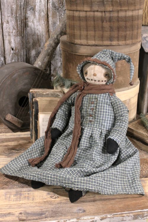 SOLD! I love how she turned out. This beauty measures 19.5 inches long not including her hat. Her head is heavily aged, then painted, lightly sanded and she has a wooden nose and a stitched mouth and eyes. She wears a skinny stocking cap with a rusted bell on the end and a matching dress and matching pants. All heavily aged. Her "mittens" and "boots" are black flannel, and I added a couple of aged patched to her dress. Her arms are wired for gentle posing. Not meant for wee hands. She will come signed and dated and she is $122 plus shipping. To purchase, please email me at buttonboxmerc@yahoo.com. Be sure to include the name of the item you would like, your zip code and the email address that you use for PayPal. You may want to consider two choices in case your first choice doll is already spoken for. All sales are final. Orders will ship ASAP and I will refund shipping overages of $1 and up. I'll be back in January. Wishing you all a Merry Christmas and a happy New Year!