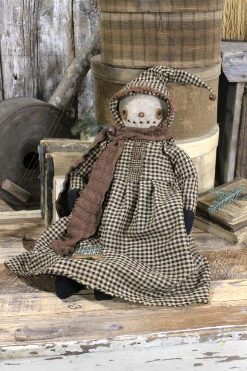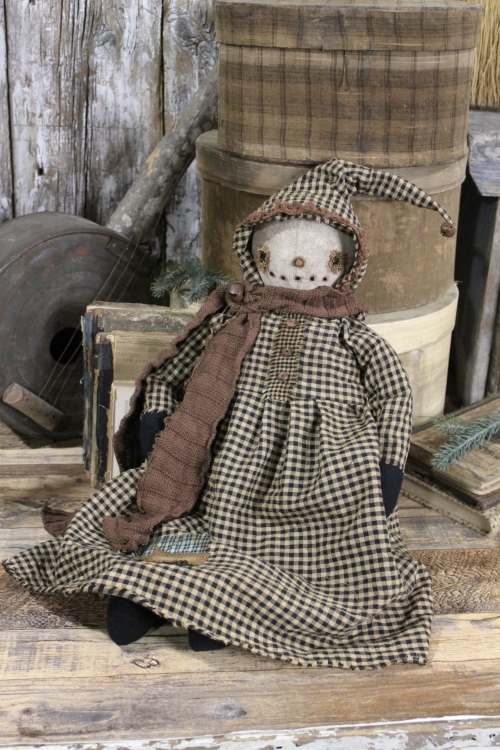 I love how she turned out. This beauty measures 19.5 inches long not including her hat. Her head is heavily aged, then painted, lightly sanded and she has a wooden nose and a stitched mouth and eyes. She wears a skinny stocking cap with a rusted bell on the end and a matching dress and matching pants. All heavily aged. Her "mittens" and "boots" are black flannel, and I added a couple of aged patched to her dress. Her arms are wired for gentle posing. Not meant for wee hands. She will come signed and dated and she is $122 plus shipping. To purchase, please email me at buttonboxmerc@yahoo.com. Be sure to include the name of the item you would like, your zip code and the email address that you use for PayPal. You may want to consider two choices in case your first choice doll is already spoken for. All sales are final. Orders will ship ASAP and I will refund shipping overages of $1 and up. I'll be back in January. Wishing you all a Merry Christmas and a happy New Year!