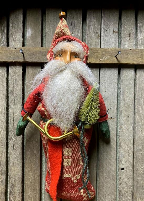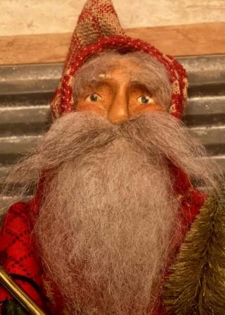 I’ve created this folky Santa with a hand sculpted one of a kind paper clay face. He has hand painted features and my favorite primitive churro beard and hair. He’s dressed in primitive flannel. The stocking he’s tucked into as well as his hat are coverlet fabric in Christmas hues. A rusty jingle bell is stitched to the tip of his hat. He has a long wool scarf and his waist is tied with green jute rope. He is adorned with a hand dyed sisal tree and a vintage brass toy horn. just about 14 inches long... He will come signed and dated. *tis spoken for, thank you*