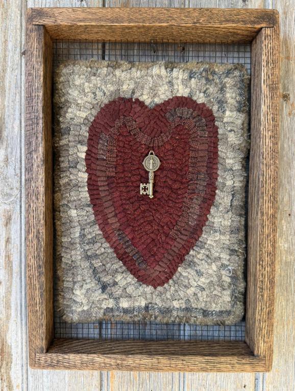 I designed and hooked this little heart mat, which measures 8 x 11 inches, with wool strips and mounted a decorative key to it. I then mounted it on one of our handmade sifter frames, which measures 10 x 14 1/2 inches. I used #9 cut strips and hand-dyed wool. The shipping is included in the price.