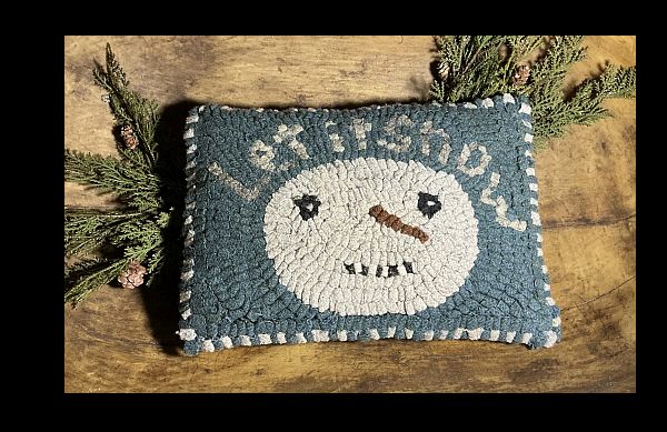 A sweet little 10 1/2" x 8" hooked pillow. I designed and hooked it using #9 cut wool strips. A lovely blue background with the words "Let it Snow" and the face of a sweet snowman. It is backed with the same off-white wool I used for the face. It does appear whiter than it actually is! Stitched together by hand to form the pillow and stuffed with wool snips, which gives it a nice, heavy, lumpy feel. Shipping is included in the price!