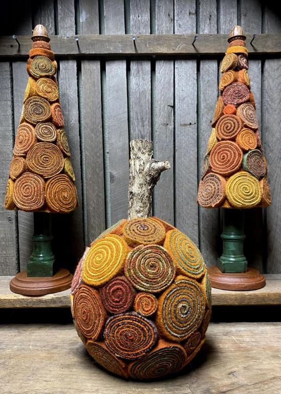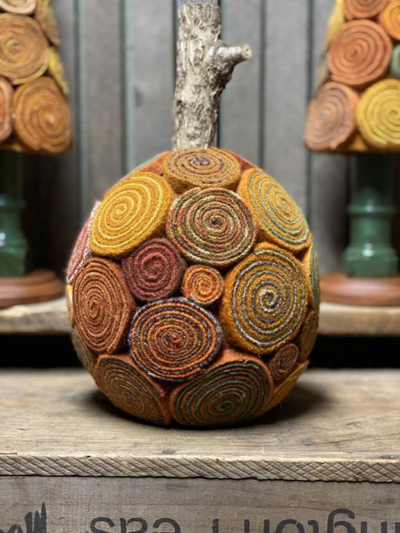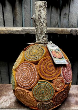 This is one of my favorite fun wool quillie pumpkins, created by rolling multicolored strips of wool together. They have combined beautifully to create this one of a kind heirloom quality pumpkin. I’ve attached them to a heavy wool pumpkin stitched from vintage rug wool and stuffed firmly. The stem is a piece of thick bittersweet. A one of a kind treasure that should bring you joy for many years to come! About 7 inches diameter and 12 inches tall including the stem, and will come signed and dated. . *tis spoken for, thank you*