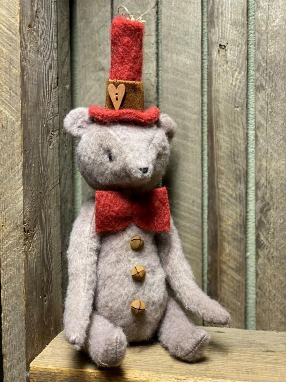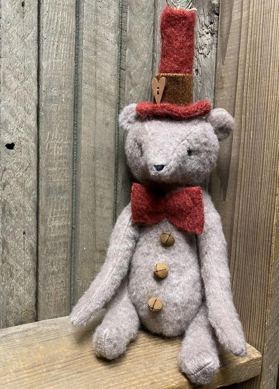 I’ve stitched this prim lil bear from my own hand dyed plush felt, and aged him nice and dark for a perfect old time appearance. He has beaded eyes and a stitched nose and mouth. His legs are stitched in place and he has thread jointed arms. He’s dressed in his finest woolen bowtie, and woolen stovepipe top hat with velvet trim and wooden heart button.. I've stitched rusty bells on his tummy. He's just the sweetest thing ever. He will come signed and dated. He‘s just under 11 inches tall, including his hat, as he sits. Created with many loving stitches in my smoke free home, a Sassafras Hill original. *SOLD, thank you*