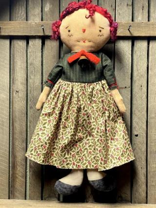 My folky and sweet little Raggedy Ann doll has been stitched from linen and she is stuffed very firmly with fiberfil. She’s been aged, painted, and well sanded for a perfect old time appearance. Her dress is sewn from reproduction cotton prints reminiscent of earlier days. The bloomers are natural cotton.