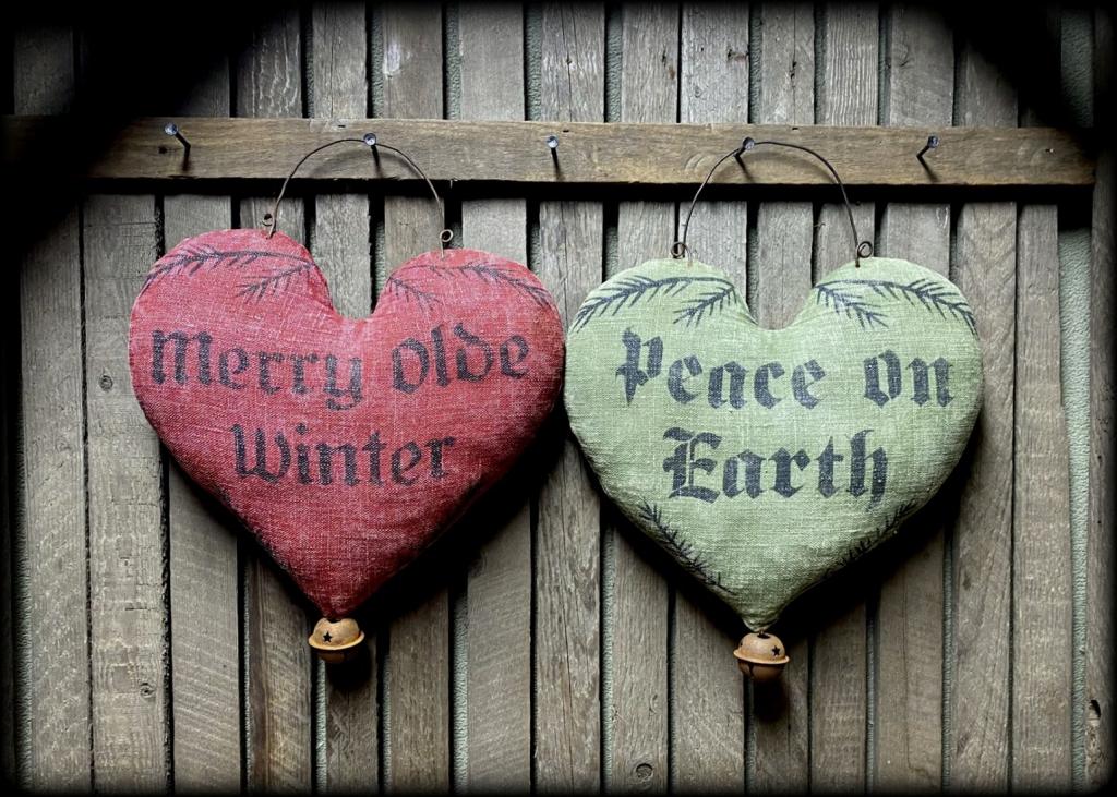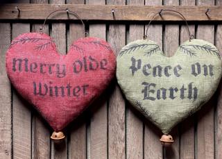 I've created these extra prim grainsack winter hearts from heavy natural linen. They're stuffed firmly with fiberfil. I've stenciled in olde time grainsack style a winter sentiment as pictured. I've painted them, aged them deeply and added rusty jingle bells and heavy rusty wire hangers. Hearts are just about ten inches across and twelve inches long, including the hanging loop and bell. They have been been created by me, Denise Davis, in my smoke free, kittycat friendly home, a Sassafras Hill original. sold individually. *both are spoken for, thank you*