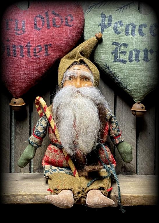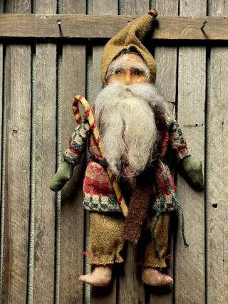 I’ve created this folky Santa with a hand sculpted one of a kind paper clay face. He has hand painted features and my favorite primitive churro beard and hair. He’s dressed in primitive coverlet fabric and wool. A rusty jingle bell is stitched to the tip of his hat. He has a long wool scarf and his waist is tied with green jute rope. He is adorned with a handmade paper wrapped candy cane. just about 15 inches long... He will come signed and dated. *tis spoken for, thank you*