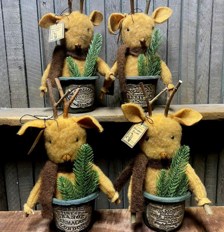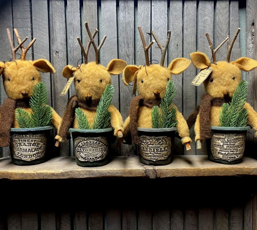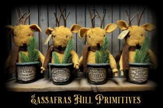 I’ve created these prim reindeer from plush felt and aged them nice and dark for an old timey appearance. They have beady eyes and a jingle bell nose. Their antlers are chunky forked twigs. Their necks are wrapped with a wool strip. Their arms are string jointed and can be repositioned as you wish. I’ve nestled them permanently with moss and faux greenery inside a heavy 4.5 inch painted peat bucket trimmed with an aged clay crockery stamp. They're just over eleven inches tall and will come signed and dated. Sold individually... Choose by LABEL SAYING from the dropdown menu. Created with many loving stitches in my smoke free home, a Sassafras Hill original. *all are spoken for, thank you*