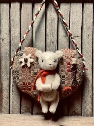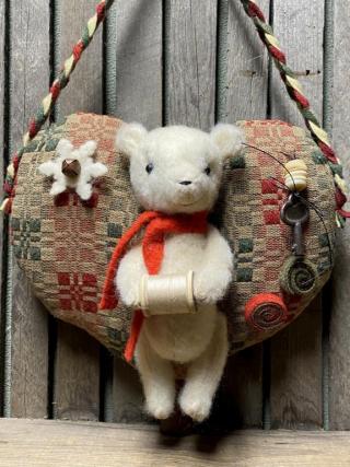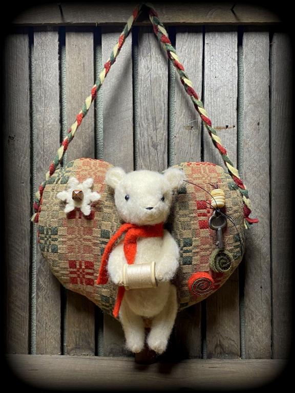 I’ve stitched this prim bear from creamy plush felt, and aged him nice and dark for a perfect old time appearance. He has beaded eyes and a stitched nose and mouth. His legs and his arms are thread jointed. He has a woolen scarf and is carrying a pretty vintage silk thread spool. I've stitched him on the front of a coverlet heart. The heart is adorned with a wool braided hanger and rusty bell on the tip. Additionally I've added an antique skeleton key dangling from a hank of antique buttons, a wool snowflake trimmed with a rusty bell, and some wool quillies in shades of Christmas *spoken for, thank you*