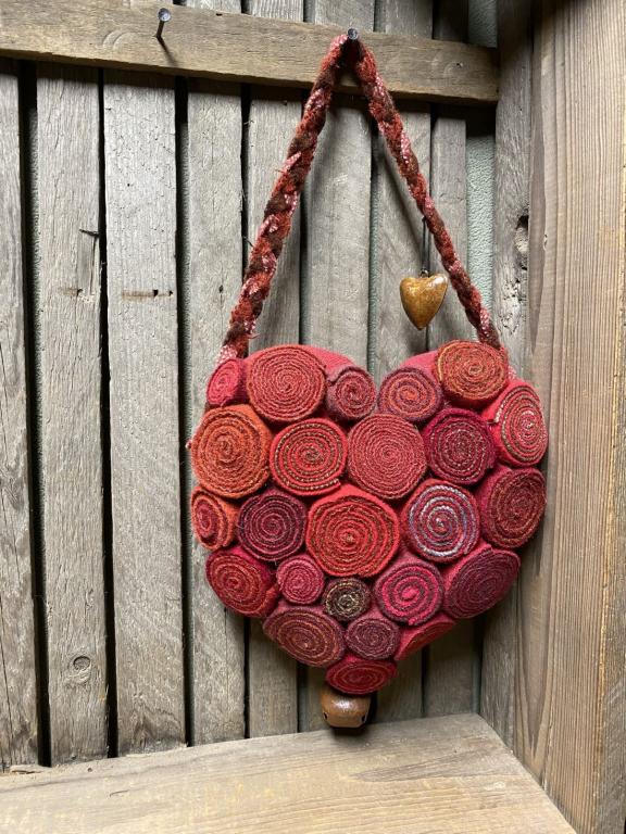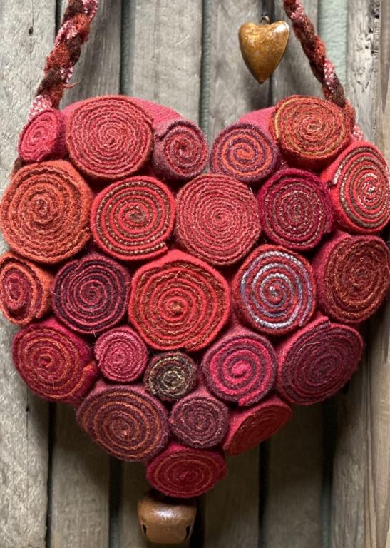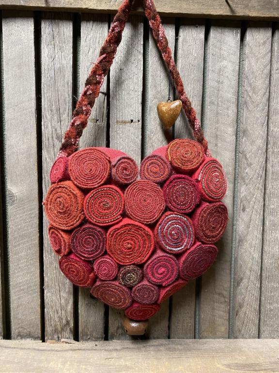 This is one of my fun rolled wool quillie Valentine hearts, created with strips of wool rolled together. They combined quite nicely for this beautiful heart hanger. There are countless hours of work rolling and assembling this piece. The quillies are applied to the front side of a wool heart. I’ve added a beautiful braided wool hanger and a rusty heart bell and jingle bell on the tip. . A one of a kind treasure that should bring you joy for many years to come! About 15 inches long, including the hanger, and about 8 1/2 inches across. Created with many loving stitches in my smoke free home, a Sassafras Hill original. *'tis spoken for, many thanks for your purchase*