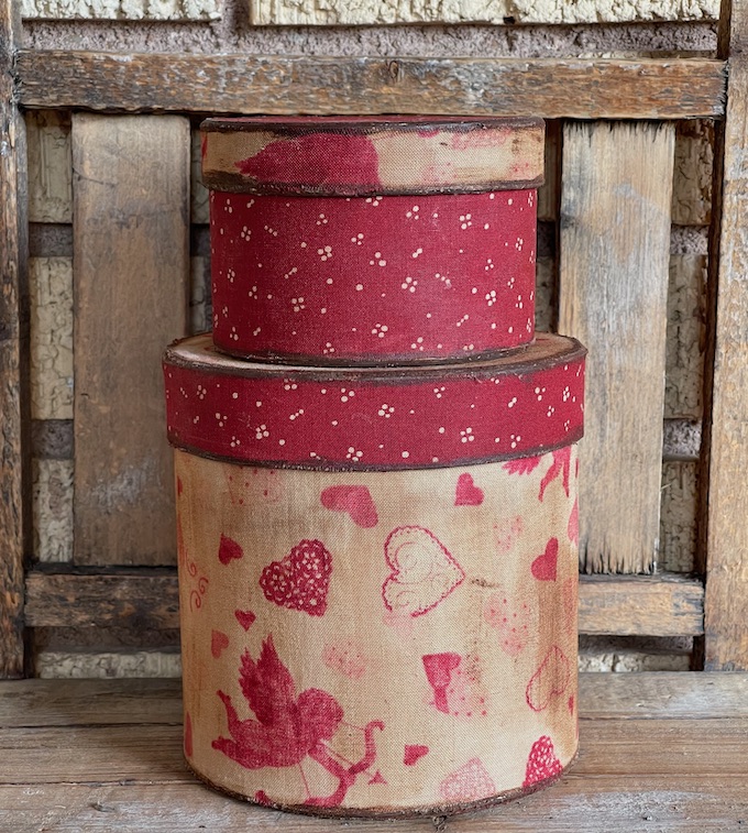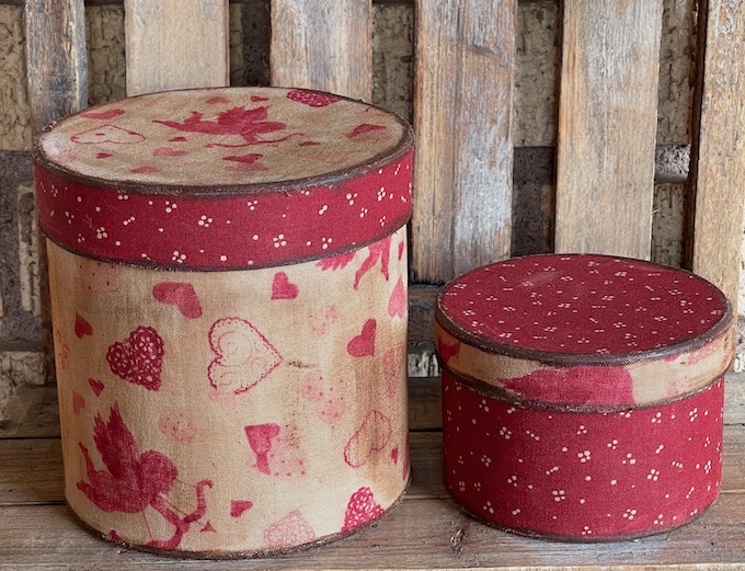 *SOLD* Set (A) 2 Primitive Fabric Covered Boxes Valentine's Day Themed