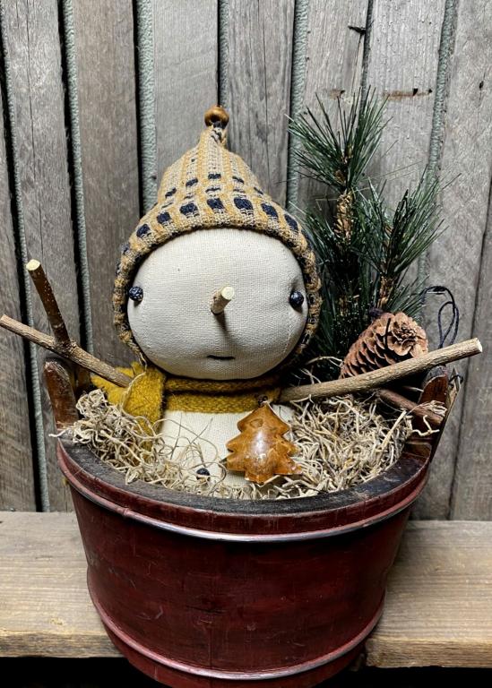 I’ve stitched this sweet lil snowman from osnaburg. He's been stuffed firmly, aged, and painted. He has beady eyes, twig nose, and a stitched mouth. He sports a coverlet hat and aged woolen scarf. He has beaded buttons. He has a prim little tree bell dangling from his scarf, and a rusty bell sewn to the tip of his hat. He has twiggy arms and He is tucked inside a vintage bucket with some faux greenery and moss. Bucket is about 7.5 inches diameter. He’s about 11” tall including his hat. He will come signed and dated. *tis spoken for, thank you*