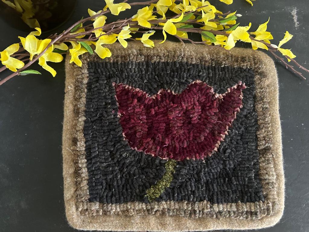 Hook~Sold~ I hooked this primitive tulip mat using over dyed wools a sweet mat to display on stand, table or hang….it measures approximately 11” x 10” Happy Spring! Thank you for visiting $65.00