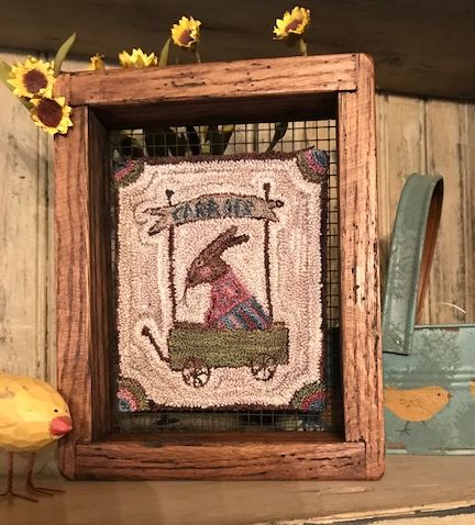 I punched this design by Robin Leuschen of Bird In The Hand Primitive. A cute little rabbit in a carrot cart. It measures 4 1/2 x 5 1/2, is punched with Valdani threads, backed with wool, and mounted on one of our reclaimed wood sifter frames! Come ready to hang, or it sits nicely on a shelf or cupboard. I added 2 magnets to the top corners of the punched piece to hold it in place on the wire. Shipping is included in the price.